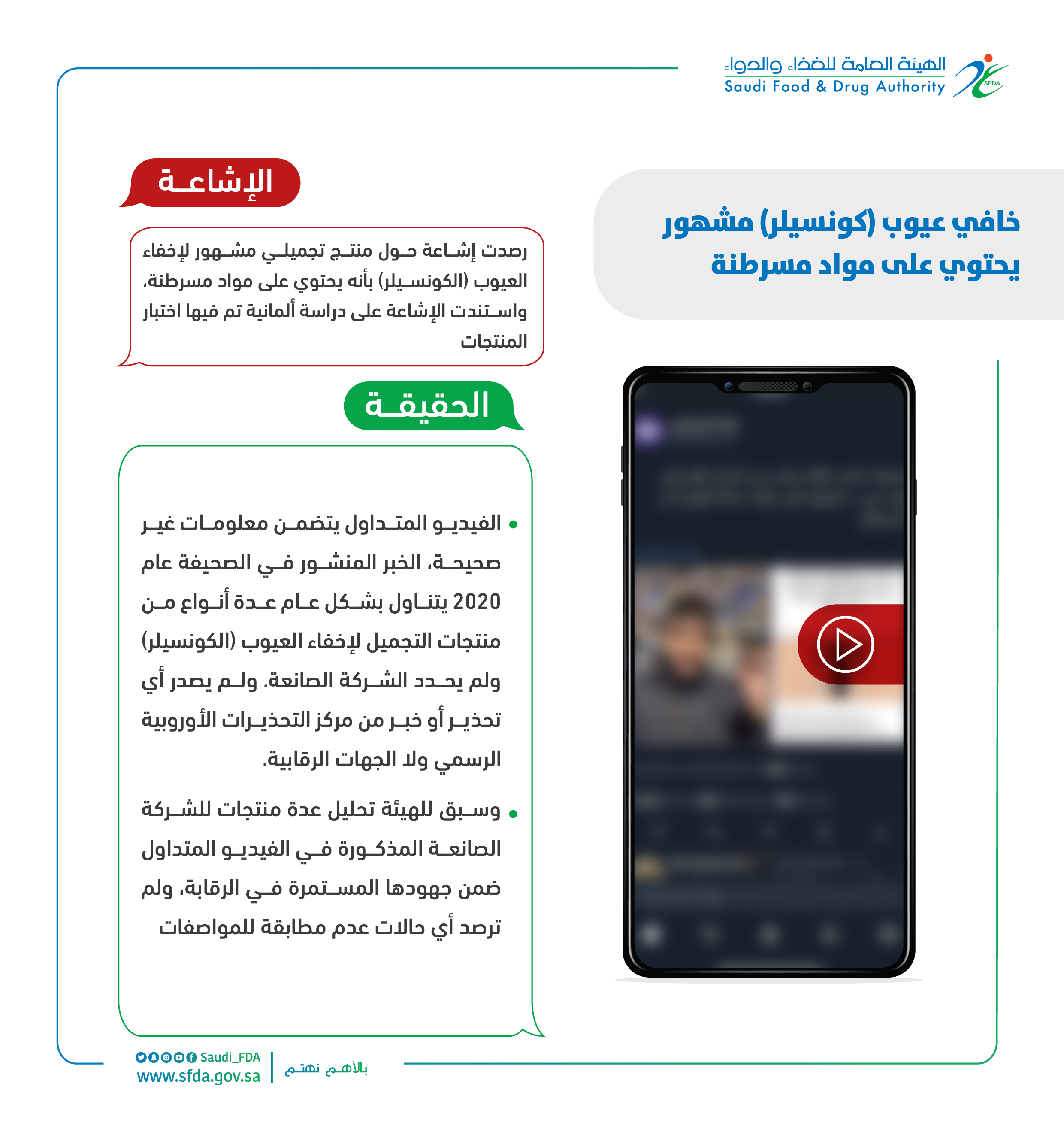 الفيديو المتداول يتضمن معلومات غير صحيحة، الخبر المنشور في الصحيفة عام 2020 يتكلم بشكل عام عن عدة أنواع من منتجات التجميل لإخفاء العيوب (الكونسيلر) ولم يحدد شركة الصانعة. ولم يصدر أي تحذير من مركز التحذيرات الأوروبية ولا الجهات الرقابية. وسبق للهيئة تحليل عدة منتجات للشركة الصانعة المذكورة في الفيديو المتداول ضمن جهودها المستمرة في الرقابة. ولم ترصد أي حالات عدم مطابقة للمواصفات.