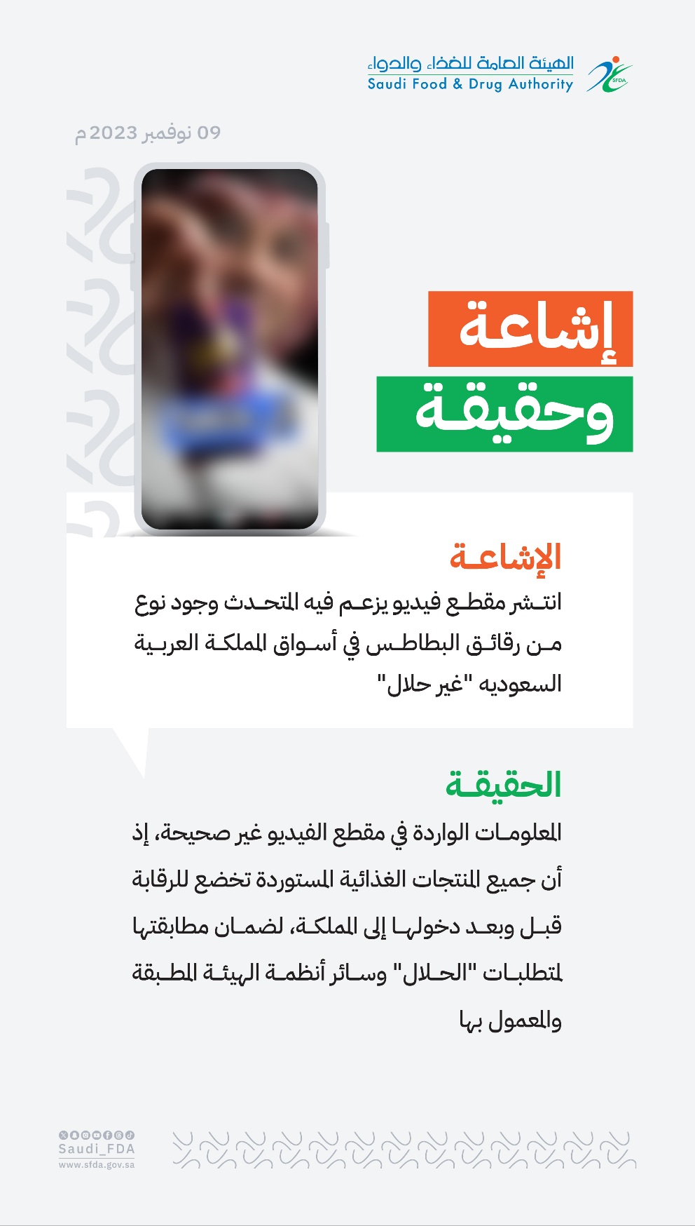 المعلومات الواردة في مقطع الفيديو غير صحيحة، إذ أن جميع المنتجات الغذائية المستوردة تخضع للرقابة قبل وبعد دخولها إلى المملكة، لضمان مطابقتها لمتطلبات "الحلال" وسائر أنظمة الهيئة المطبقة والمعمول بها