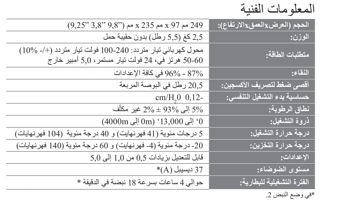 يدعم نمط الاوكسجين المتقطع فقط، يأتي مع الجهاز ٢ بطارية + شاحن كهرباء منزلي + شاحن كهرباء لاستخدام في السيارة + شنطة الجهاز